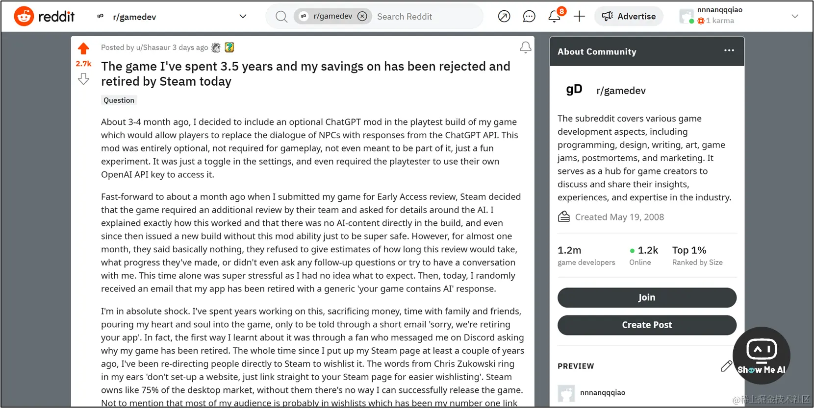 这是 Reddit 论坛的一篇热帖,是一位开发者的控诉和求助,他耗费了数年心血和积蓄开发的游戏,因使用了 ChatGPT 而被 Steam 下架。