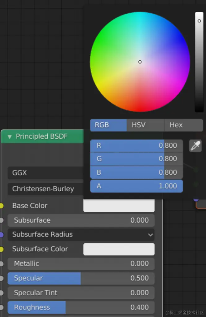 图5.搅拌机的材料描述;基色为:R: 0.8克: 0.8深: 0.8A: 1.0 金属色设置为 0 粗糙度设置为 0.4