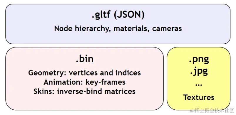 - JSON 文件:描述场景、节点及其层次结构;网格、材质、相机、光源。它还包含指向二进制和图像数据的指针。