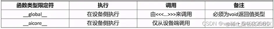 核函数是直接在设备端执行的代码。在核函数中,需要为在一个核上执行的代码规定要进行的数据访问和计算操作,当核函数被调用时,多个核将并行执行同一个计算任务。核函数需要按照如下规则进行编写。