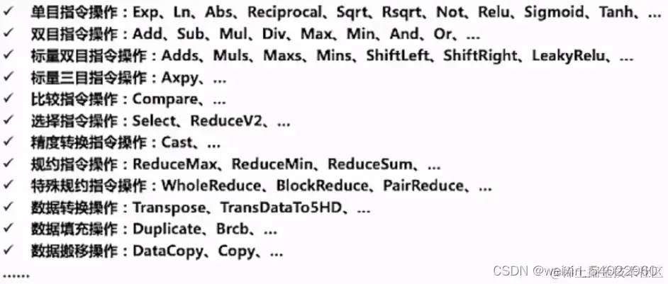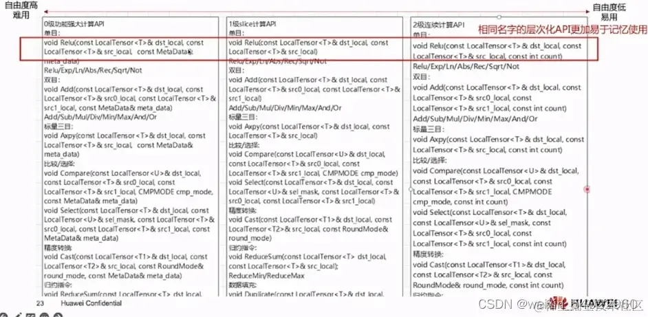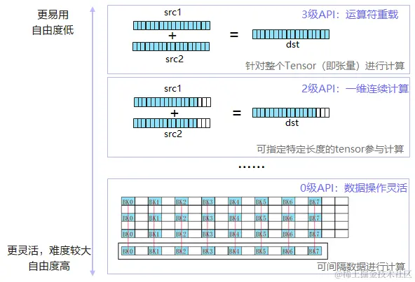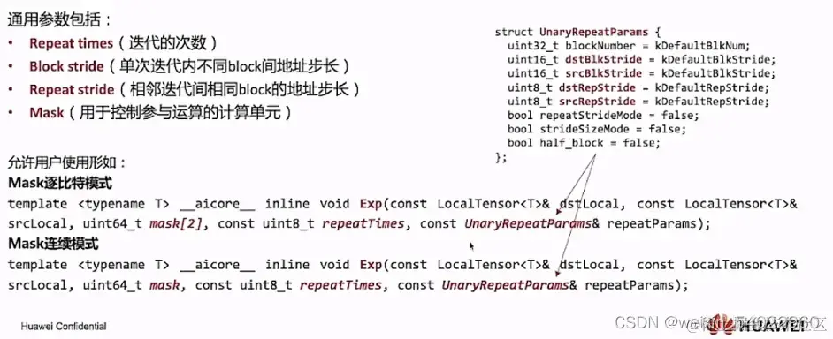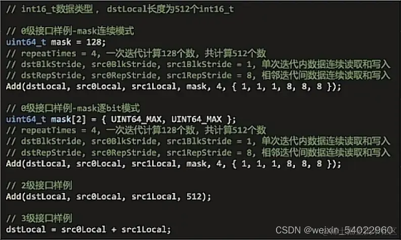 0级功能灵活计算接口,是最底层的开发接口,可以完整发回硬件优势的计算API,可以进行非连续计算,该功能可以充分发回CANN系列芯片的强大功能指令,支持对每个操作数的Block stride,Repeat stride,MASK的操作,允许用户使用诸多的通用参数来定制化所需要的操作: