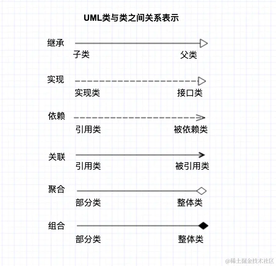 实现关系(Realization/implements): 即 接口和实现类之间的关系。类实现了接口中的抽象方法。用带空心三角箭头的虚线来表示实现关系,箭头从实现类指向接口。