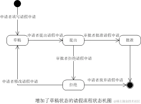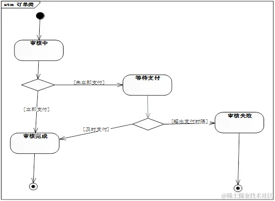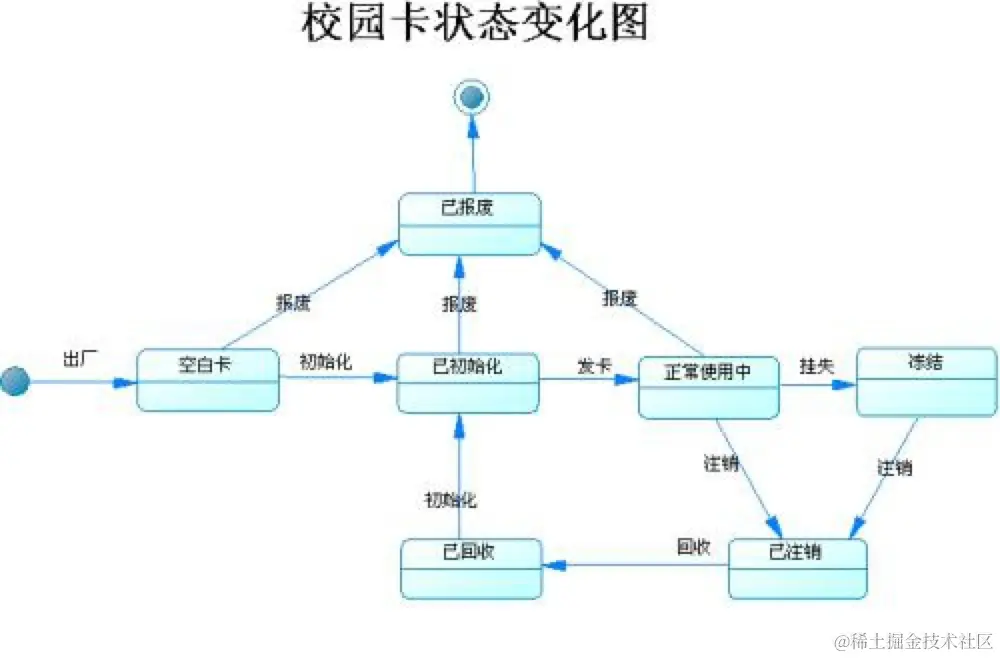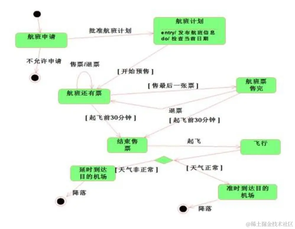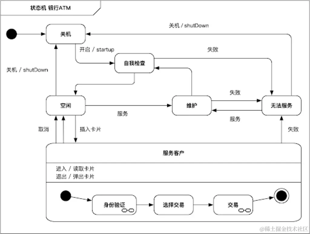 状态机图描述的是围绕某一事物状态变化的图。它和活动图的区别在于,活动图是描述事物发生的流程,是多个角色参与的,而状态机描述的是事物的状态变化,并没有角色这个概念。