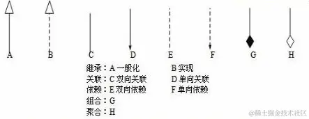 关联关系(Association): 单向关联用一个带箭头的实线表示,箭头从使用类指向被关联的类; 双向关联用带箭头或者没有箭头的实线来表示