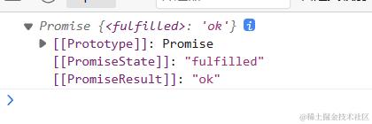 - resolve :异步操作执行成功后的回调函数,指定了成功的状态为fulfiled(成功状态), 且成功状态的值为你设置的ok