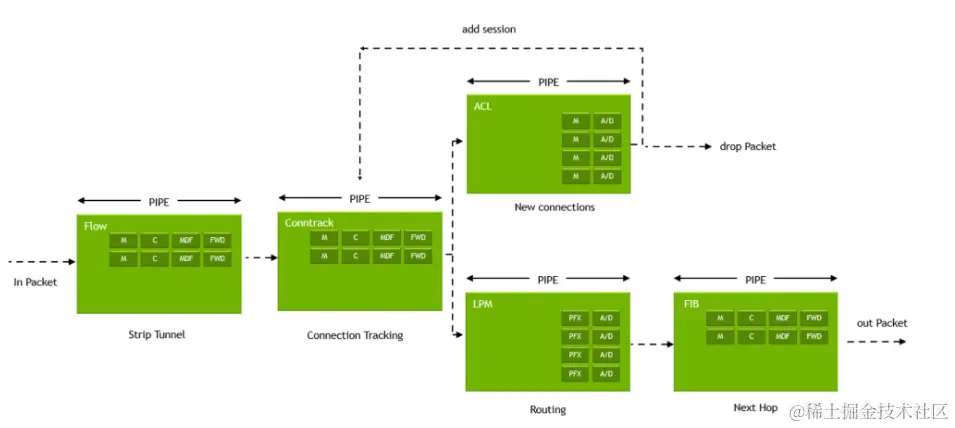 此外,它被设计用于处理涉及以极高的速率建立和删除流水线的场景,并且每秒可以管理数百万个数据包交换。其适用于软件定义网络应用程序、数据分析、虚拟交换、人工智能推理、网络安全和其他数据包处理应用程序。它支持基于预定策略或其他标准的接收、检查报文头和有效负载、跟踪连接以及检查、重新路由、复制或丢弃数据包之类的操作。