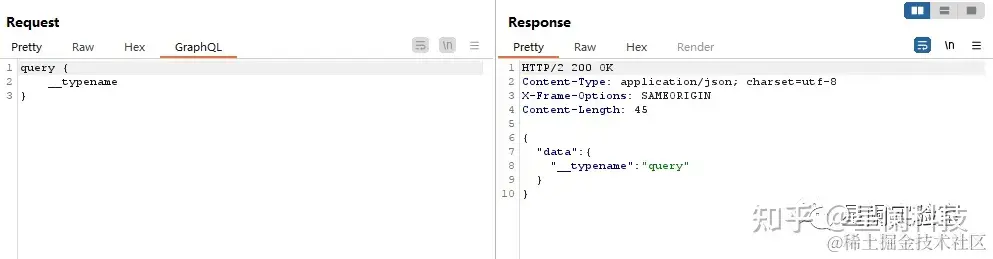 由于GraphQL API中存在一个__typename 的保留字段,该字段会以字符串形式返回查询对象的类型,所以我们可以向未知API发送query{__typename},如果响应中返回{"data": {"__typename": "query"}},那么就可以确定该API为GraphQL API。