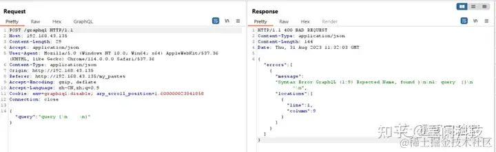 除此之外,根据报错信息可以判断是否为GraphQL API,主要特征是Syntax Error: Expected Name, found。