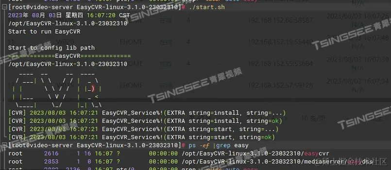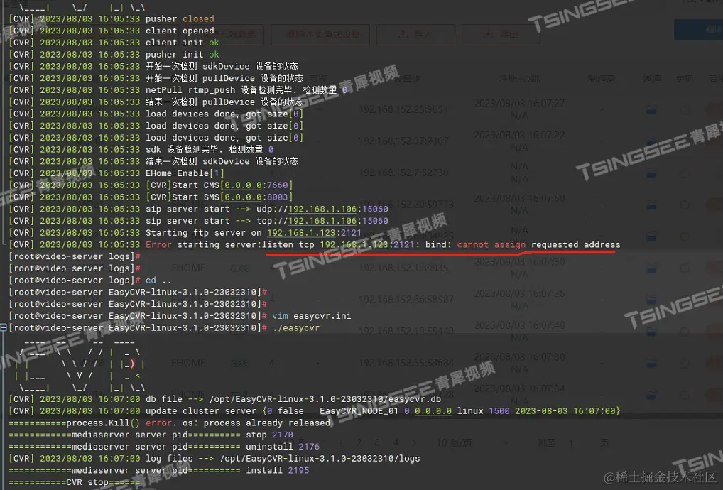 1)首先通过软件运行./EasyCVR进程,查看是否正常,在使用进程查看时,发现打印了starting server:listen tcp ,由下图可以看到,由于启动失败导致无法监听这个ip;