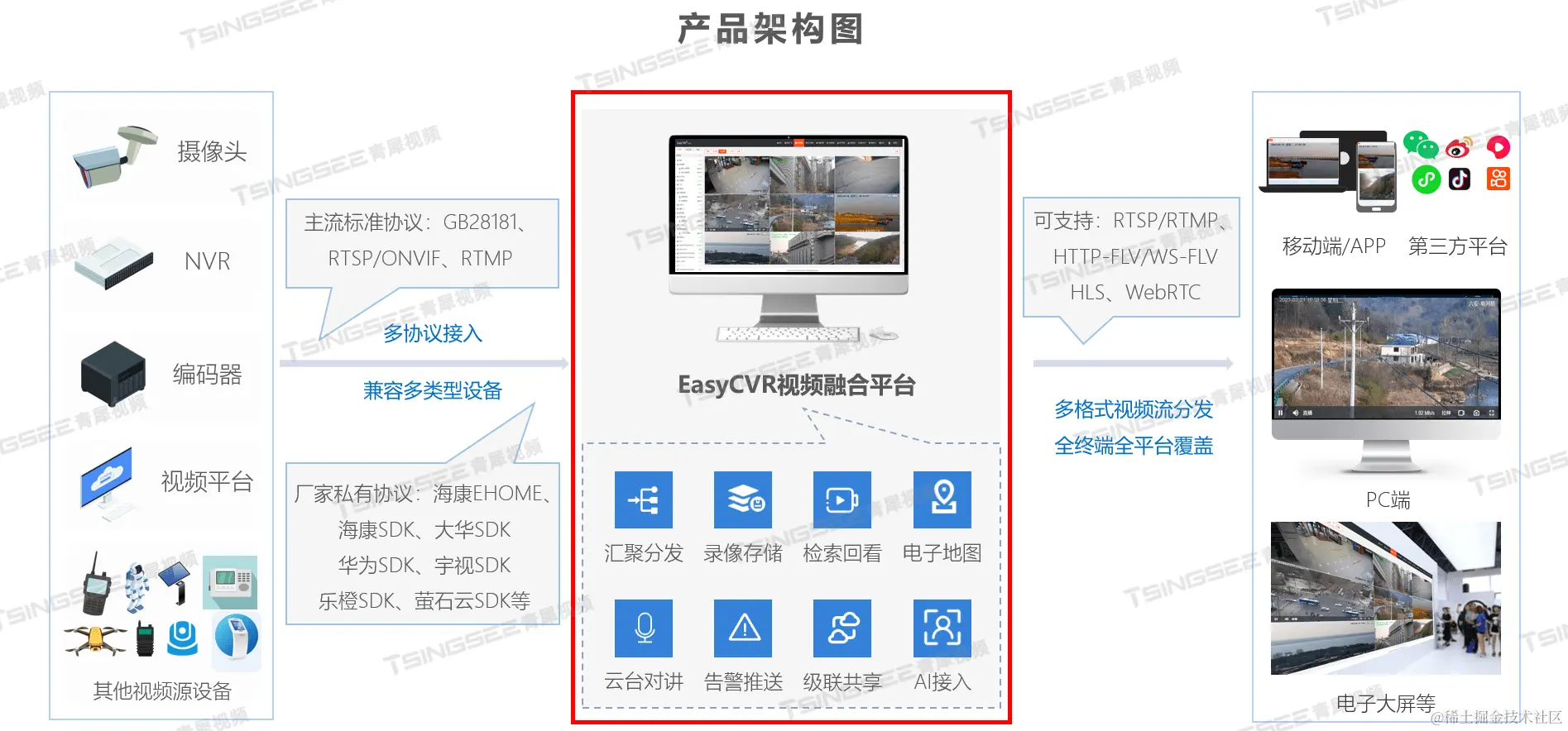 智能视频监控/视频云存储/集中存储/视频汇聚平台EasyCVR具备视频融合汇聚能力,作为安防视频监控综合管理平台,它支持多协议接入、多格式视频流分发,TSINGSEE视频监控综合管理平台EasyCVR支持海量视频汇聚管理,可应用在多样化的场景上,包括城市“一网统管”建设、智慧工地风险预警、智慧工厂安全生产可视化监管、校园视频大数据综合管理等,感兴趣的用户可以前往演示平台进行体验或部署测试。