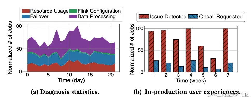 图 a 中展示了一段时间内每天使用 StreamOps 成功诊断出的各大类运行时问题的数量,图 b 展示了一周内每天成功诊断出的问题数和使用诊断后继续进入人工 Oncall 处理的对比。之前当遇到运行时问题时,用户通常会直接拉起人工 Oncall,可以看到接入智能诊断有效降低了人工 Oncall 的数量。