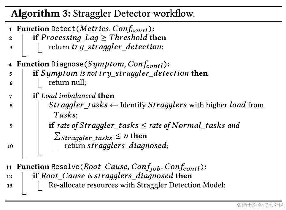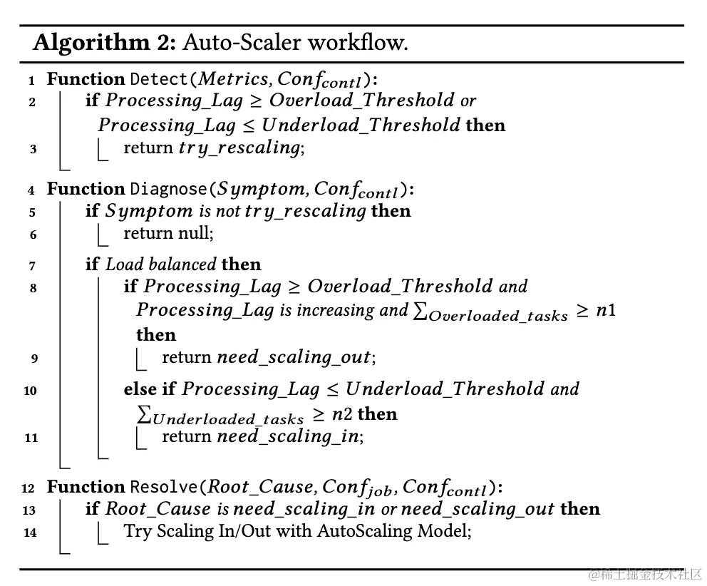上图展示了管控策略决策的总体流程,管控策略首先从指标采集器中获取流式作业运行时的指标和配置信息,然后遵从发现、诊断、解决三步走的步骤根据获取到指标和配置信息进行决策,最后交由流式作业配置变更器进行执行,常见的执行机制包括扩缩容、节点迁移或者只是发送报警让用户手动处理。