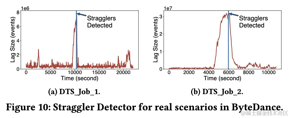 下图展示了字节内部两个有代表性的生产作业受慢节点影响导致消息积压的案例,StreamOps 可以准确识别并自动迁移慢节点,有效解决因慢节点导致的消息积压问题。