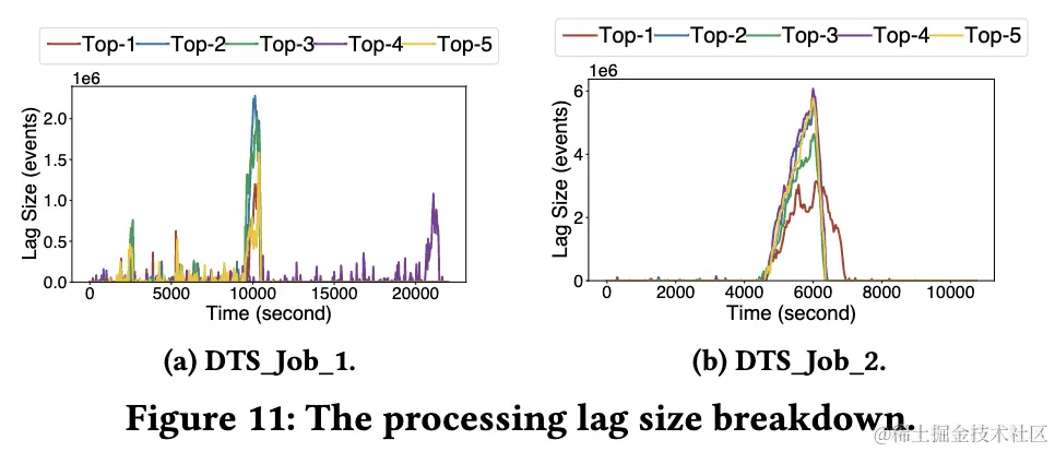 下图进一步展示了上述两个作业 top-5 积压的 Partition 和对应的积压量,可见 80% 以上的消息积压集中在 top-5 Partition 中,说明了消费这些 Partition 的节点运行在慢节点上,StreamOps 准确识别了这些慢节点并且迁移后确实积压得到了解决。