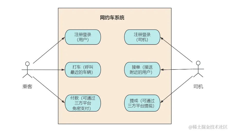 其中,司机通过平台约定的比例抽取分成(70%-80%不等),乘客可以根据第三方平台的信用值(比如支付宝)来开通免密支付,在下车后自动支付订单。用例图如下: