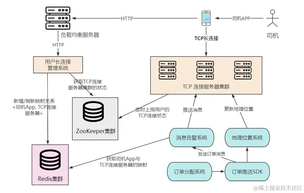当司机 App 第一次登录,或者和服务器断开连接(比如服务器宕机、用户切换网络、后台关闭手机 App 等),需要重连时,司机 App 会通过用户长连接管理系统重新申请一个服务器连接(可用地址存储在 Zookeeper 中),TCP 连接服务器后再刷新 Redis 的缓存。