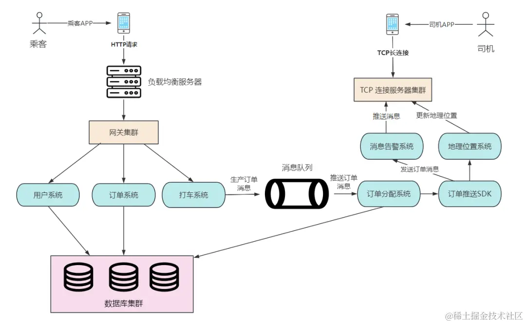 当用户打车时,通过负载均衡服务器将请求打到某一个网关服务器上,网关首先会调用订单系统,为用户创建一个打车订单(订单状态为 “已创建”),并存库。