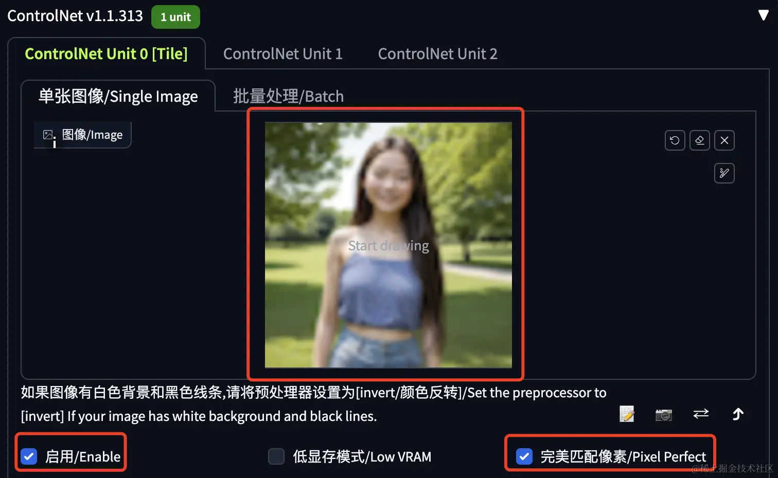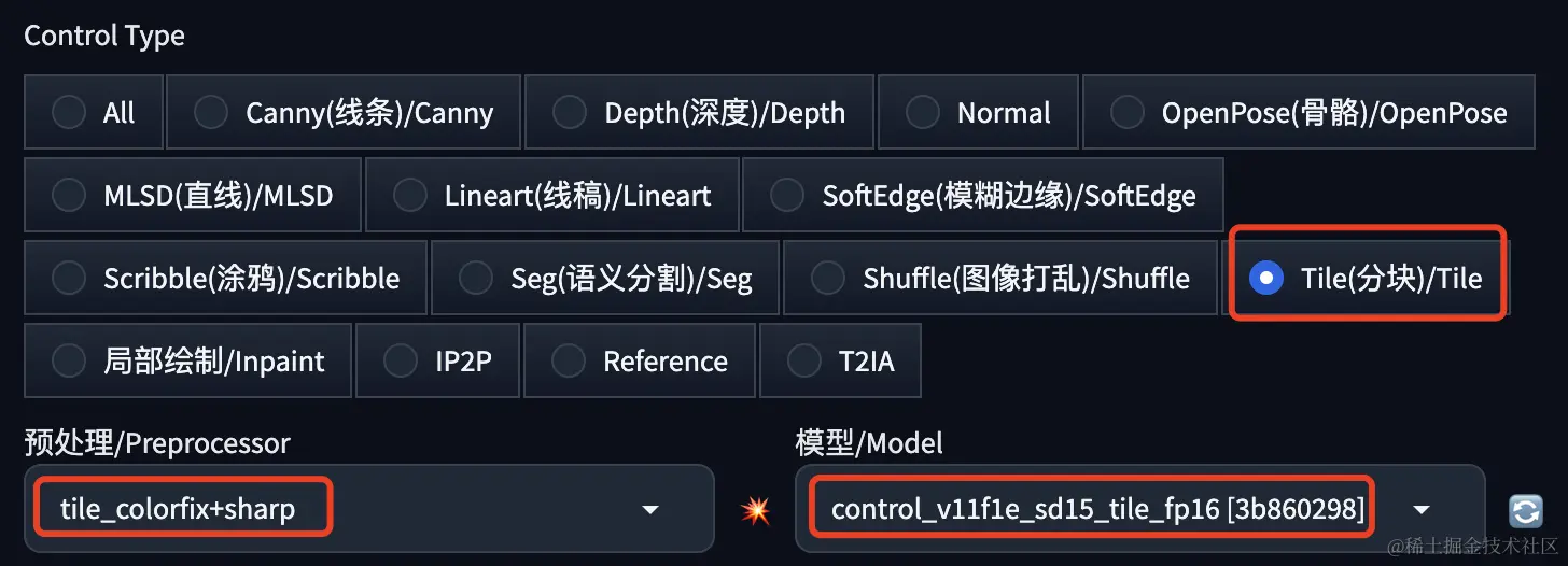Control Type 选择 Tile,预处理器和模型会自动加载。