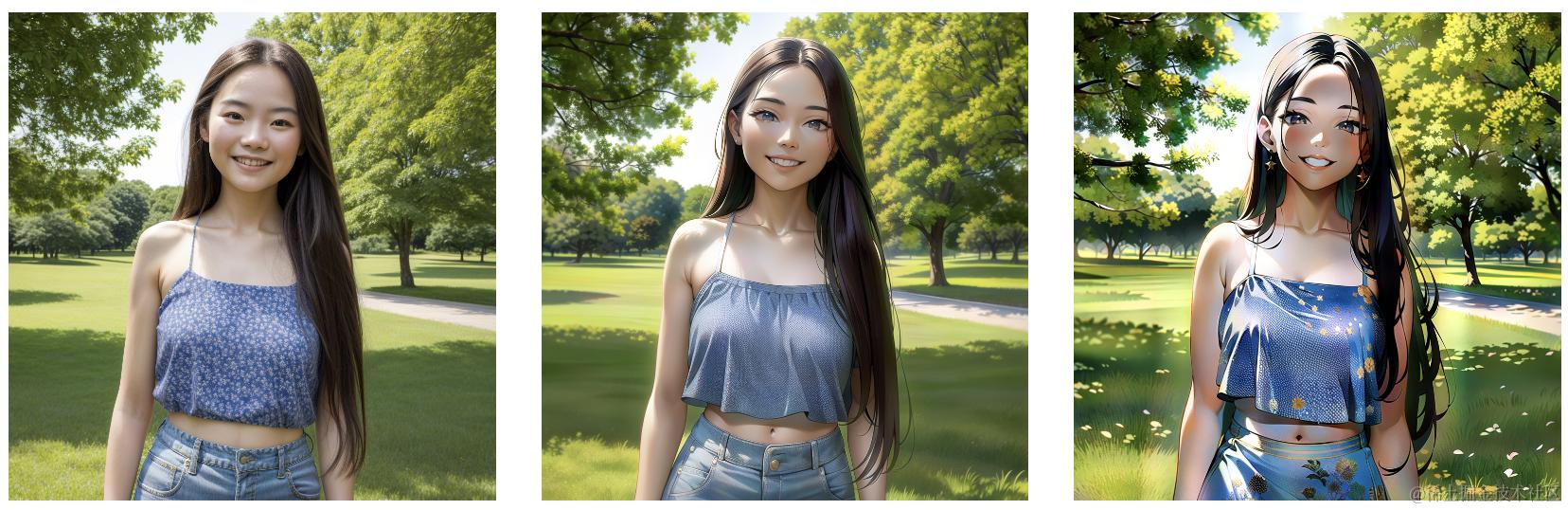 权重为 1 时,因为原图比较简单,出现了明显的瓦片颜色不协调问题。权重为 0.3 时模型发挥了更大的作用,色彩搭配好了很多。