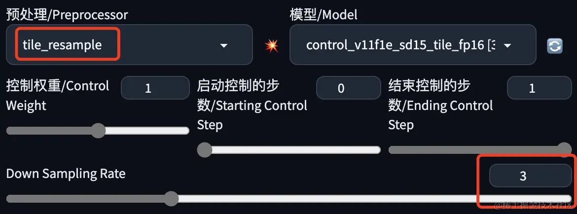 resample 有一个名为 Down Sampling Rate 的参数,这个参数的作用是按照比例缩小参考图,降低参考图的分辨率,然后生成图片的时候就可以产生更多的细节。