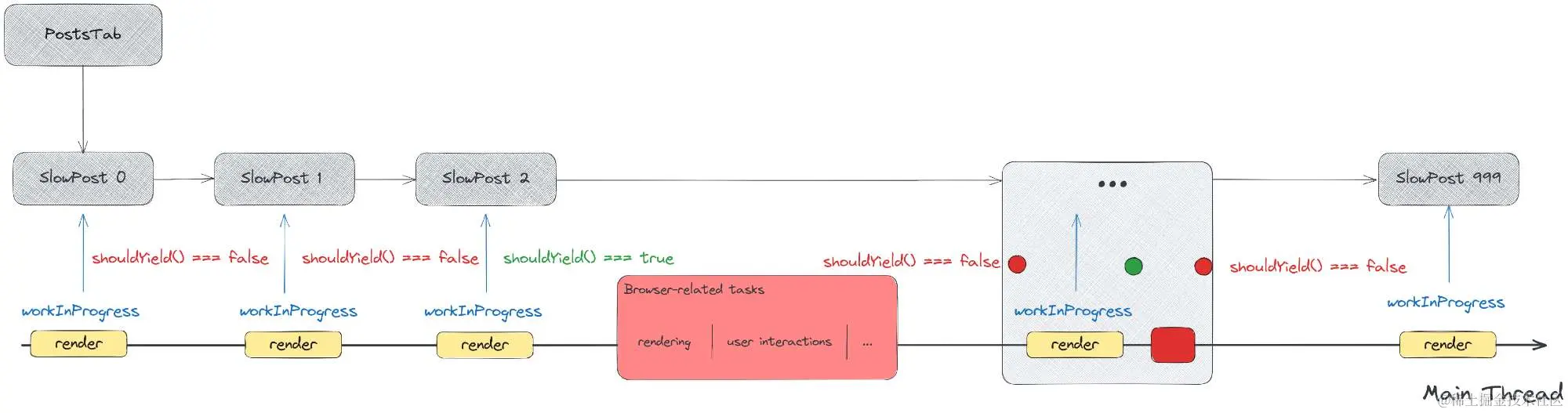 在初始示例中,有 1000 个 workInProgress SlowPost 组件 - 它们可以轻松分成一批批次,例如,每个批次有 5 个 SlowPost 组件,意味着这样的批次将花费 5 毫秒。完成一批后,轮到浏览器在其他任务上工作,然后再次等待另一批次,如此循环重复,直到没有其他内容需要渲染。