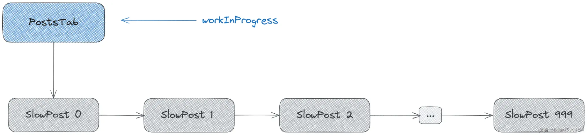 所以,首先,workInProgress = PostsTabNode,然后调用 performUnitOfWork(workInProgress),然后 workInProgress = SlowPost0Node,然后调用 performUnitOfWork(workInProgress),然后 workInProgress = SlowPost1Node,以此类推。