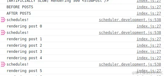 大家额外多关注一下 console.log() 调用。最重要的是 SlowPost 组件中的那个调用。