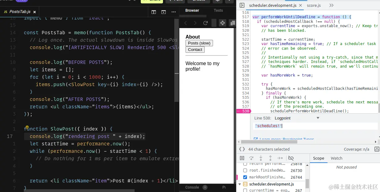scheduler.development.js文件的第 538 行添加了一个日志点- 这将让我们知道 React 何时中断渲染过程,并在浏览器执行其它任务后重新安排渲染过程。