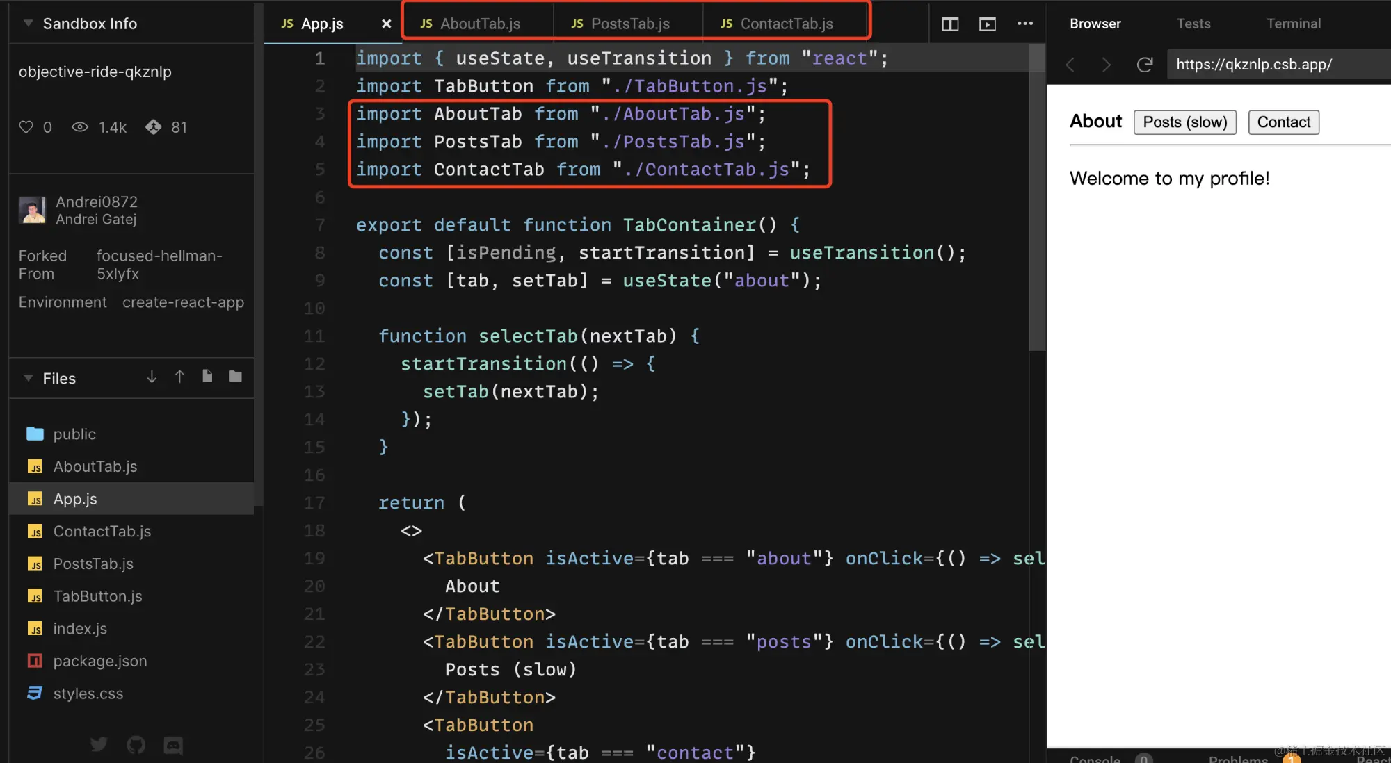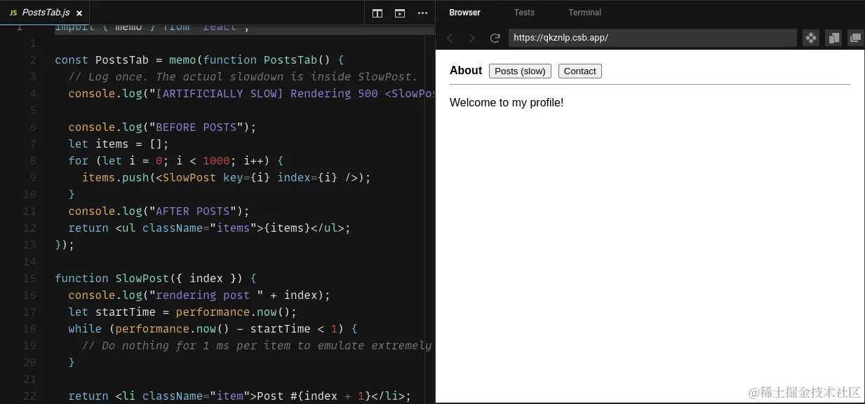 点击Posts (slow)选项卡将导致网页变得无响应,因此点击Contact选项卡只有在 4 秒后才会生效(即 PostsTab 渲染所需的时间)。