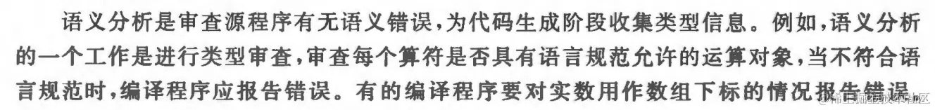 语义分析还可以包括其他任务,例如确保函数在调用前已被声明,或检查变量在使用前已被初始化等。所以作者目前认为,语义分析就是在做题或者分析的时候人工需要考虑的可能出现的问题,比如检查一下数据类型是否正确匹配等等。也就是说,程序中大部分存在的能被编译器检查出来的错误,基本上都是新手常犯的常见错误。