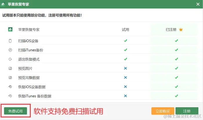 步骤1:在电脑上下载安装数据蛙苹果恢复专家,打开软件后点击【免费试用】。