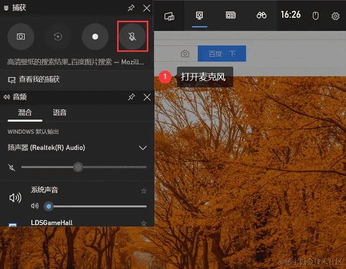 步骤2:按快捷键 “Win+G” 打开 “Xbox Game Bar” ,进入录制界面,确保选择的录音设备是您刚刚设置的设备,然后打开麦克风。