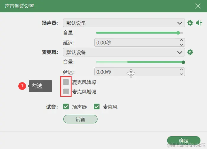 步骤2:在视频录制模式中,麦克风是外部声音,扬声器是内部声音,可以根据自己的需求来选择打开还是关闭,在右上角的音量符号还可以进入声音调试设置,这里可以勾选麦克风降噪和麦克风增强,让我们录制的声音更加清晰。