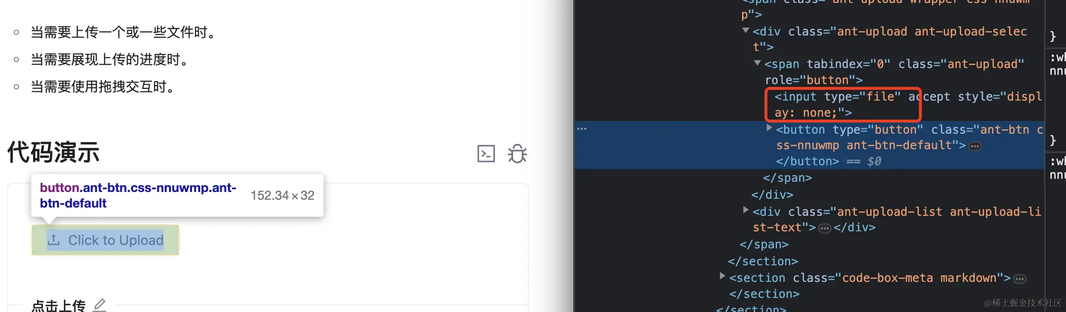 可以看到 input file 隐藏在了后面,大概率就能联想到通过间接的方式点击了 input file,这个不难实现,domInput.click()即可。