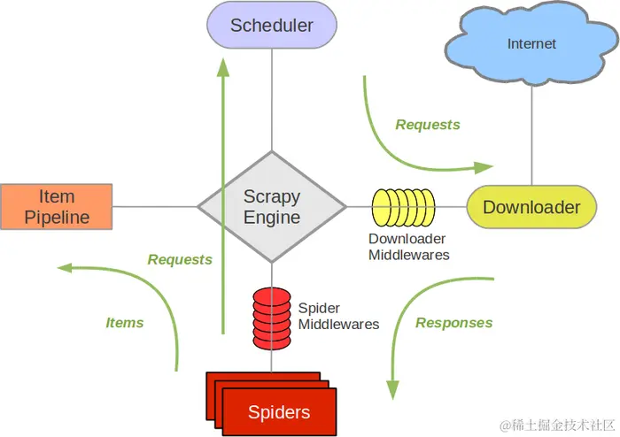 Scrapy Engine (引擎): 是框架的核心,负责Spider、ItemPipeline、Downloader、Scheduler中间的通讯,信号、数据传递等。并在发生相应的动作时触发事件。 **Scheduler (调度器): **它负责接受引擎发送过来的Request请求,并按照一定的方式进行整理排列,入队,当引擎需要时,提供给引擎。 **Downloader (下载器):**负责下载引擎发送的所有Requests请求,并将其获取到的Responses交还给引擎。 **Spider (爬虫):**负责处理由下载器返回的Responses,并且从中分析提取数据,获取Item字段需要的数据,并将需要跟进的URL提交给Scrapy Engine,并且再次进入Scheduler。 **Item Pipeline (项目管道):**它负责处理Spider中获取到的Item,并进行进行后期处理(清理、验证、持久化存储)的地方. **Downloader Middlewares (下载中间件):**引擎与下载器间的特定钩子,一个可以自定义扩展下载功能的组件。处理下载器传递给引擎的Response。 **Spider Middlewares(爬虫中间件):**引擎和Spider间的特定钩子,(处理进入Spider的Responses,和从Spider出去的Requests)