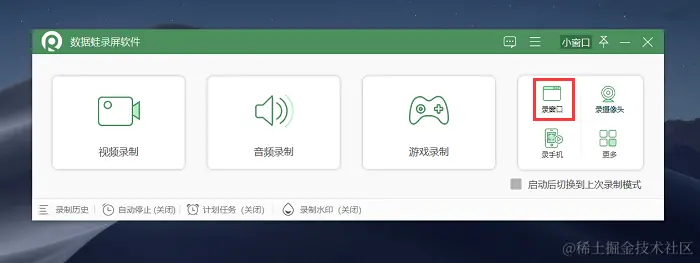 第1步:打开数据蛙录屏软件,在主页面可以选择需要的录制模式,例如游戏录制、视频录制、音频录制等,录制微信聊天记录我们选择 “录窗口” 。