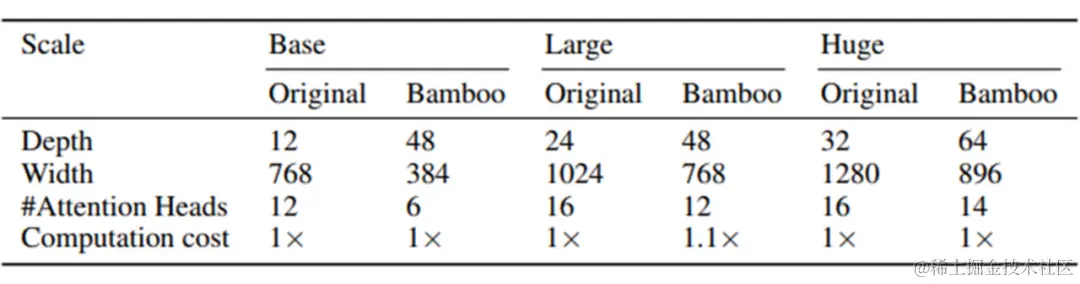 综合以上三点,可以推知 MAE 应该能够在深度上更好的拓展,也即使用更深的模型架构。本文探索了 MAE 在更深,更窄的模型设置下的表现:采用本文提出的 Bamboo(更深,更窄)模型配置,我们可以在视觉和语言任务上得到明显的性能提升。