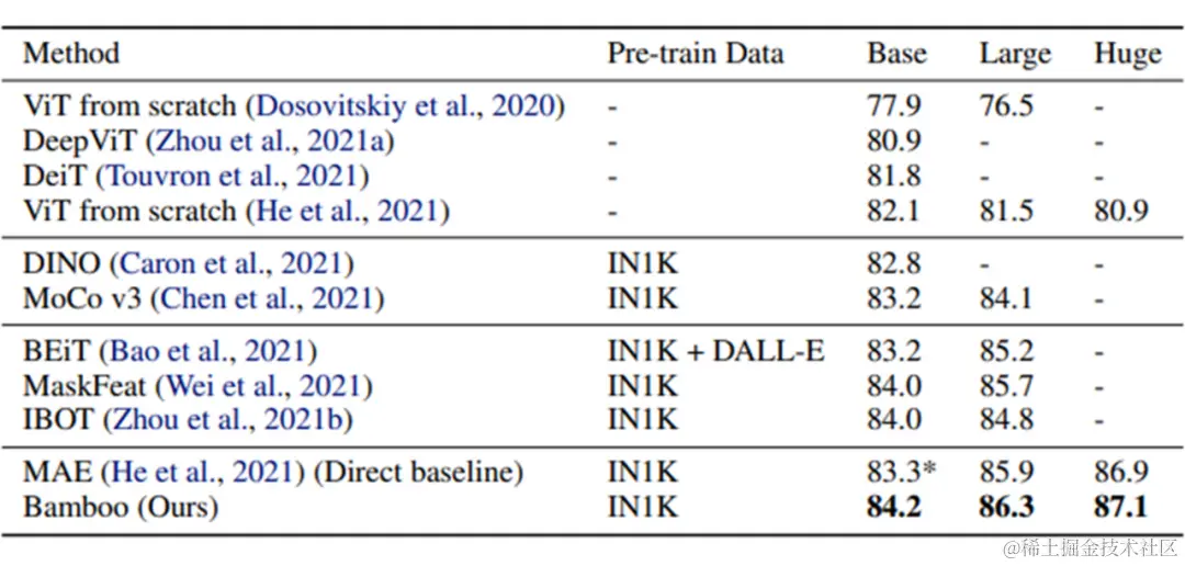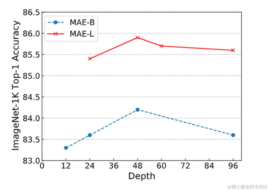 另外,我们在深度拓展性上也做了实验,可以看到,当采用 Bamboo 的配置时,MAE 能够获得明显的性能提升,而对于 ViT 而言,更深的模型则是有害的。MAE 在深度增加到 48 层时仍能获得性能提升,而 ViT 则总是处于性能下降的趋势。
