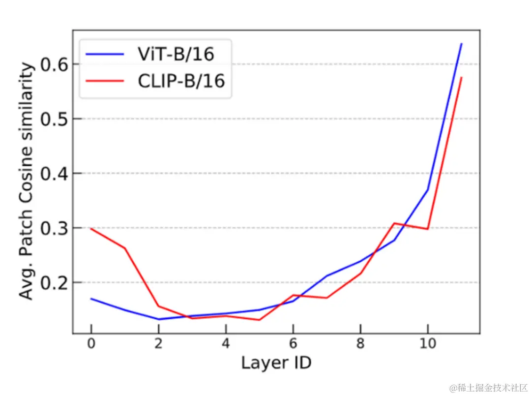 根据上述分析,我们可以得出结论:token 级的训练目标(例如语言建模中的:next token prediction)表现出较轻的 over-smoothing。另一方面,基于 sequence 级别的目标(如对比图像预训练)更容易出现 over-smoothing。为了验证这个结论,我们使用 CLIP 和 OPT 进行了类似的 cosine 相似度实验。我们可以看到 CLIP 模型展现了与 Vanilla ViT 类似的 over-smoothing 现象。这一观察结果符合我们的预期。