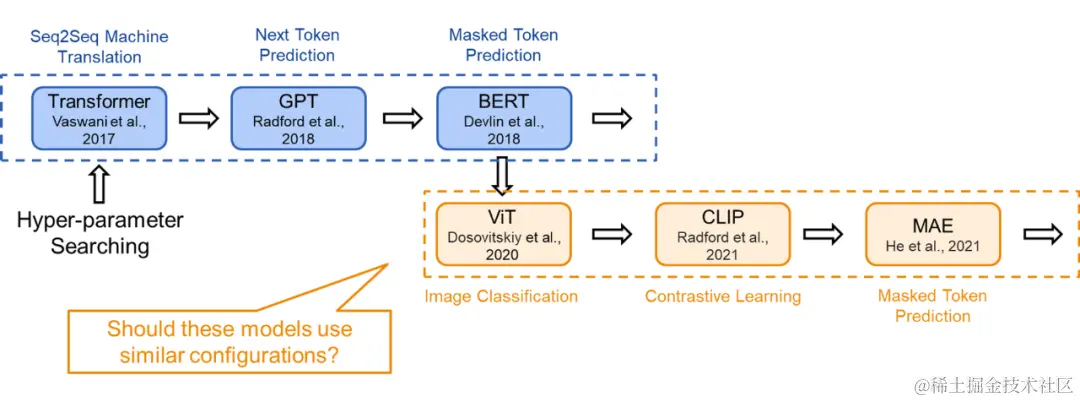 为此,我们首先对 Transformer 架构进行了溯源,回顾了代表性的工作中 Transformer 结构的来源:Vision Transformer 的作者根据 BERT 中 Transformer-base 的结构作为其 ViT 模型配置;而 BERT 在选择配置时遵循了 OpenAI GPT 的方法;OpenAI 则参考了最初的 Transformer 论文。