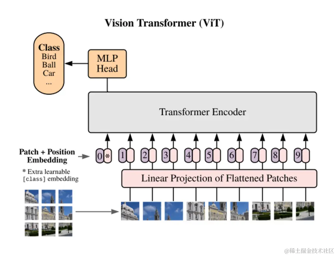 现在,Transformer 模型通过各种训练目标进行训练。以 ViT 为例,我们可以在图像分类的监督学习环境下从头开始训练 Transformer 模型。在这种直接的图像分类任务中,每个图像被建模为一个 token 序列,其中每个 token 对应图像中的一个图块。我们使用来自图像的所有 token(即图块)的全局信息来预测单个标签,即图像类别。