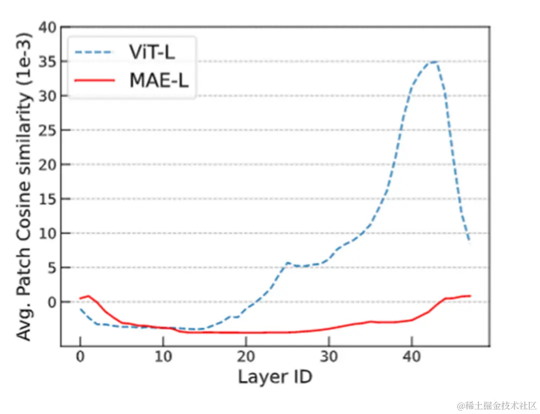 我们通过可视化的实验来验证了这一观点。我们发现 ViT 的 token 表征在更深的层中更加接近,而 MAE 模型则避免了这个问题,这说明在掩码自编码器中,over-smoothing 问题得到了缓解。通过简单的分类任务训练 Transformer 模型则不具备这一特点。