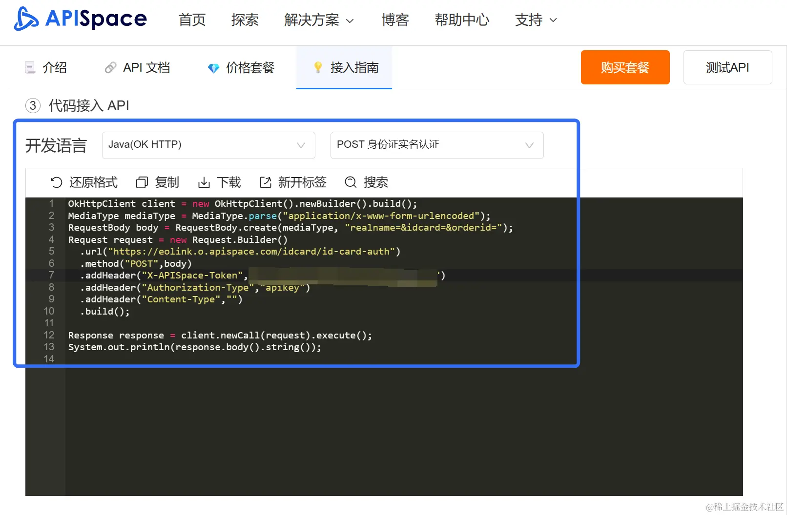 接口测试通过就可以把API接入到自己程序代码之中,完善应用的功能。APISpace 提供了各种语言的接入代码示例,以帮助开发者们快速将API接入到自己的代码之中。
