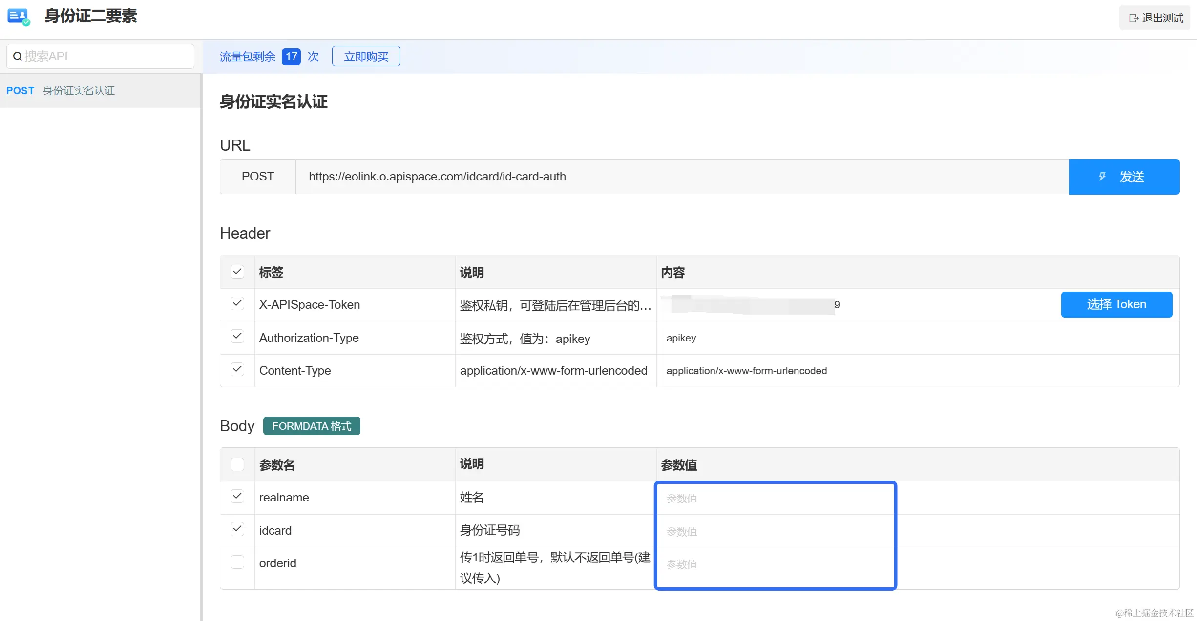 申请接口成功,进入测试页面,输入姓名和身份证号即可快速在线测试接口。