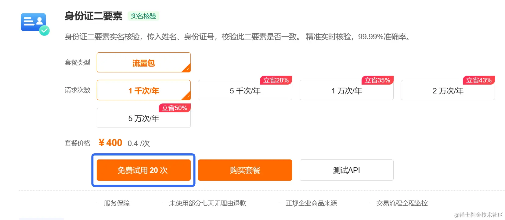 登录 APISpace,进入身份证二要素详情页,点击【免费试用】按钮,领取免费次数。