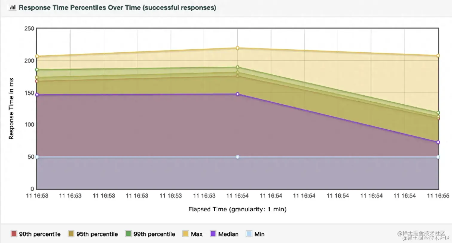 可以看到最小用时50ms,这个没毛病,接口里面睡眠了50ms,但是不管是中位数还是90/95/99线都大于150ms了,这是因为系统线程是一个很昂贵的资源,SpringBoot中tomcat默认的最大连接数应该是200,在连接池的线程被耗尽后,这200个线程在那干等50ms结束,而剩下的请求也只能等待,无法进行其它的操作。下面再看下虚拟线程的表现: