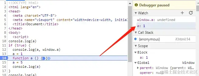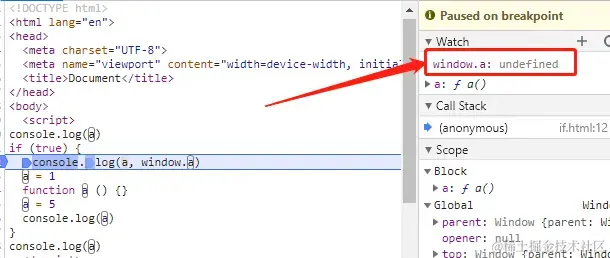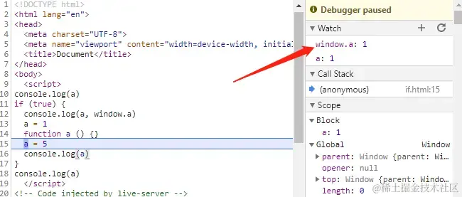function a () {} 后, 我们可以看到, 块级作用域的a的值会赋值给全局作用域的a