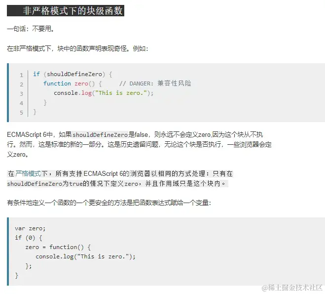 从ES6开始 在严格模式下,块里的函数作用域为这个块。ES6之前不建议块级函数在严格模式下使用. 在ES6非严格模式下, 块中函数声明会出现提升, 所以最好使用函数表达式来定义函数