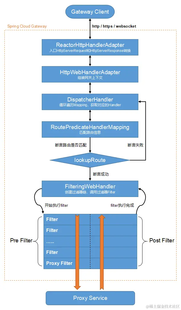 - Gateway的Predicates断言匹配到对应的路由规则,而后到达过滤器执行过滤器逻辑,如:IP黑名单校验、日志记录、鉴权、请求转换、修改等。若无法匹配到对应的路由规则,断言失败,则请求将被拒绝并返回响应的错误响应。