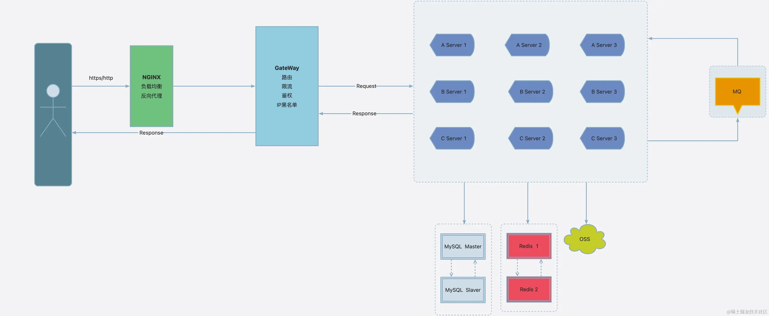 在Spring微服务架构中,请求通常是通过NGINX反向代理服务器路由到网关。下面是请求从NGINX到网关的一般流程: